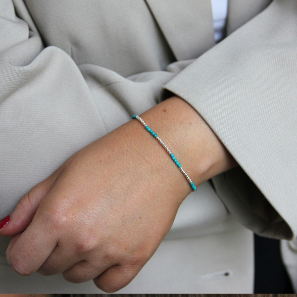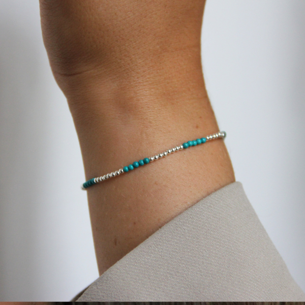 Ett otroligt gulligt armband med små silverkulor och små stenar i form av äkta "turkos". Armbandet är elastiskt och kulorna sitter på ett silikonband. Ca längd i EJ utdraget tillstånd är 17 cm.