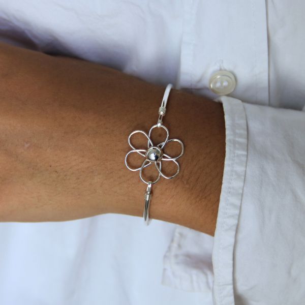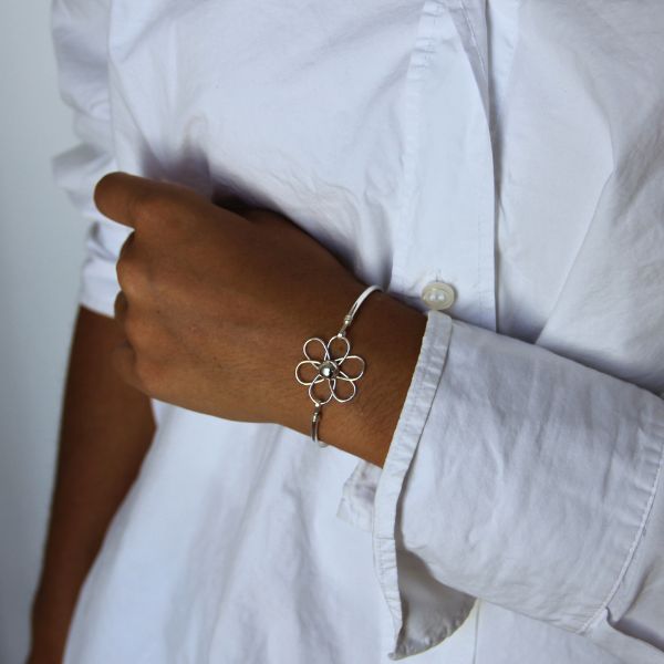 Ett stelt armband med en stor blomma mitt fram! Superfint att bära som det är eller tillsammans med andra armband. Öppnas och stängs genom att kroka i ena sidan i blomman framtill.
