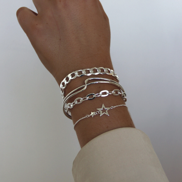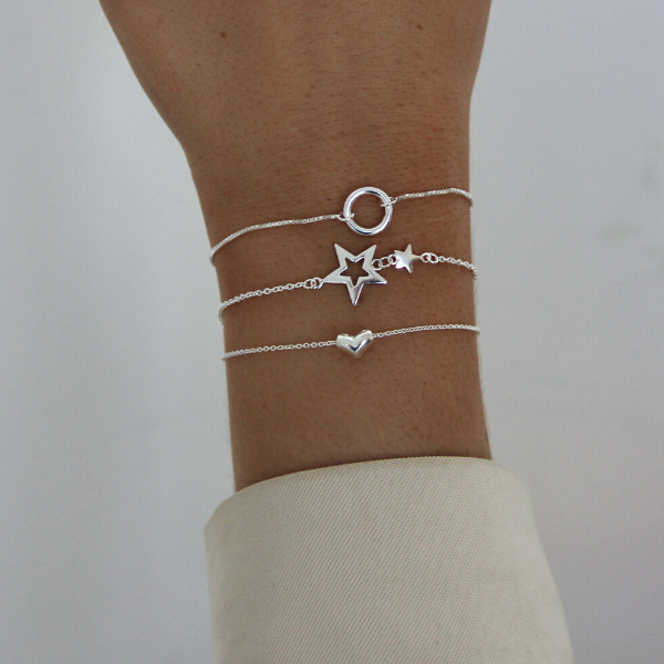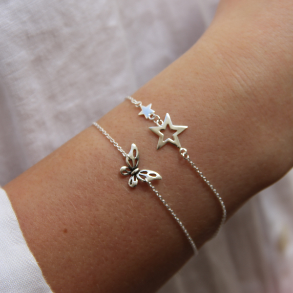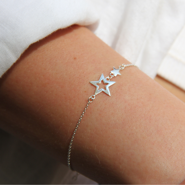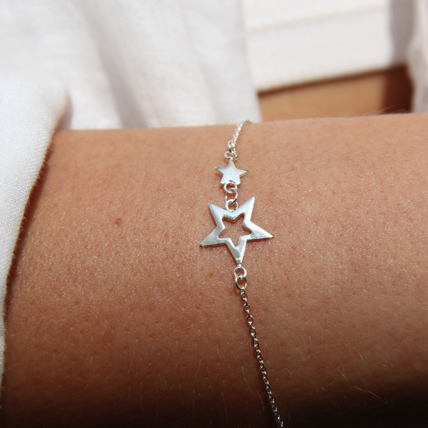 Ett underbart sött, tunnt silverarmband med en stjärnor i mitten. Största stjärnan mäter 13mm i diameter och armbandet är 16cm med en förlängning på 3cm.
