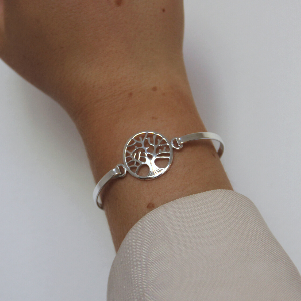 Det populära "Tree of life" här i ett stelt armband med stort träd (22mm). Tree of life står för släktskap och gemenskap och ses som ett tecken på tillväxt, utveckling, hälsa och kraft. Armbandets mått är 60x50 mm. Silverbandet som löper runt armen är 3 mm brett.