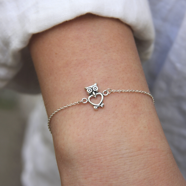 Supergulligt silverarmband med en uggla. Ugglan mäter 8x14mm. Armbandet är 16 cm.