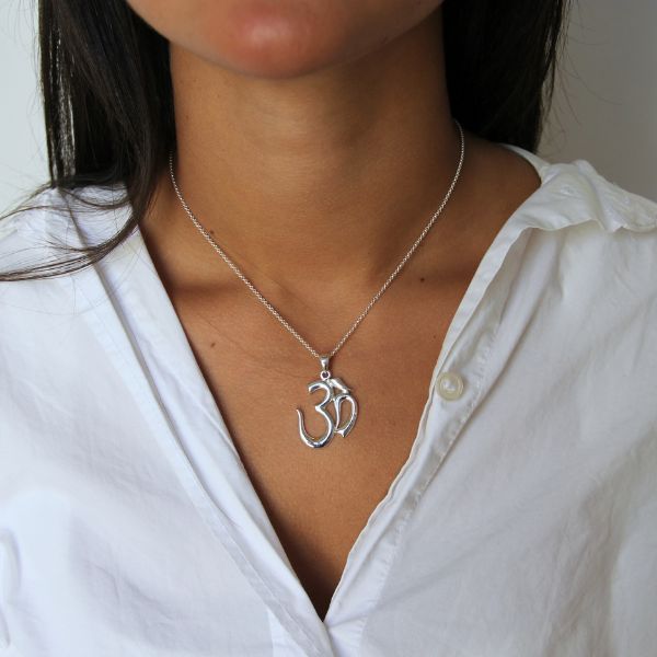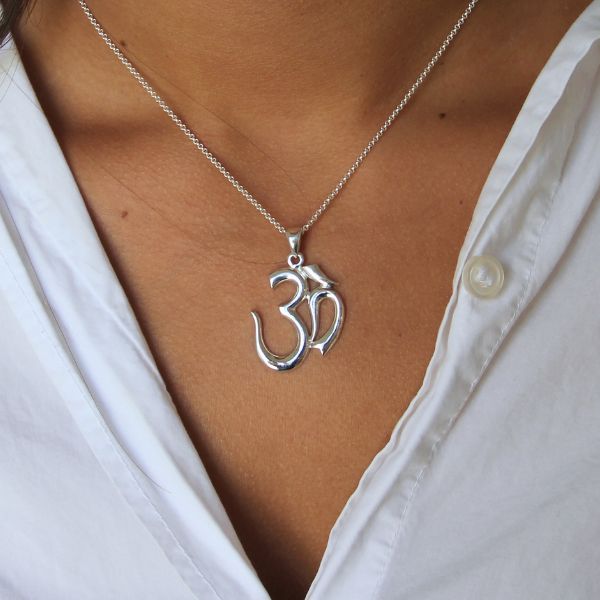 Fint halssmycke i silver med ohm-tecknet. Ohm-tecknet är det heligaste av alla tecken i hinduismen och är också helig för buddhister. Ohm-tecknet är en symbol för spirituell fullkomlighet. Ohm-tecknet är vanligt förekommande inom yogan och en vanlig symbol på yoga-smycken.