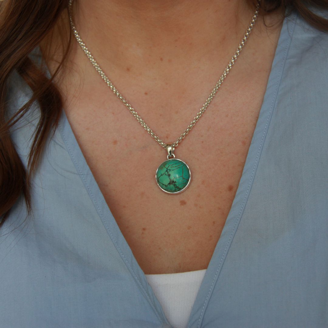 Ett fantastiskt vackert halssmycke i silver med äkta turkos med toner åt det gröna hållet. Vacker, intensiv färg. Detta halssmycke mäter ca 30mm i diameter totalt. Kedja ingår ej, det väljer du själv till i menyn för kedjor om du önskar.