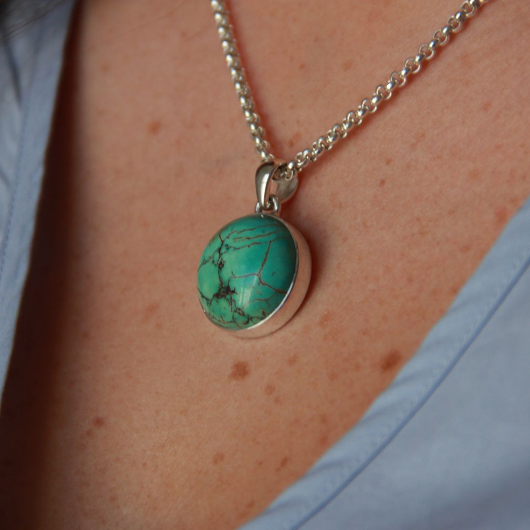 Ett fantastiskt vackert halssmycke i silver med äkta turkos med toner åt det gröna hållet. Vacker, intensiv färg. Detta halssmycke mäter ca 30mm i diameter totalt. Kedja ingår ej, det väljer du själv till i menyn för kedjor om du önskar. Stenens mönster kan skilja sig något från den på bilden. TURKOS: Turkos sägs vara visdomens sten och den lär hjälpa dig att behålla och återställa balans. Den hjälper dig som kan behöva att öka din acceptans mot dig själv, att vara självförlåtande och hjälpa dig att bearbeta saker du inte kan påverka. Den hjälper också till att acceptera misstag och misslyckanden.