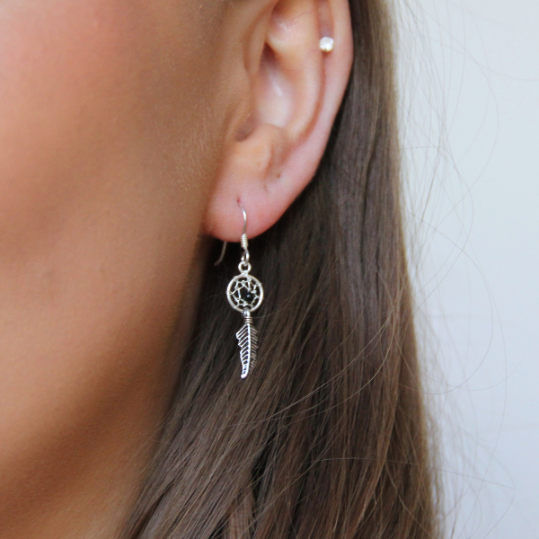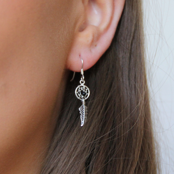Ett par små och fina drömfångare med ens vart sten som dinglar snyggt i öronen. Cirkeln är 8mm och fjädern cirka 15mm lång.