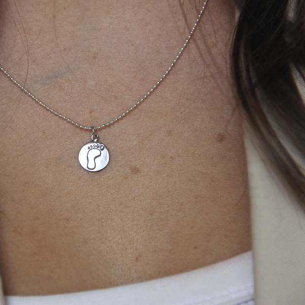 Ett halssmycke i äkta silver med ett fotavtryck på en rund platta. Plattan är 10mm i diameter. Perfekt gåva att ge bort med massor av symbolik - någon som gjort ett bra avtryck i ditt liv? Någon som lämnar positiva fotprint efter sig, vart de än går? Visa uppskattningen med detta halssmycke!