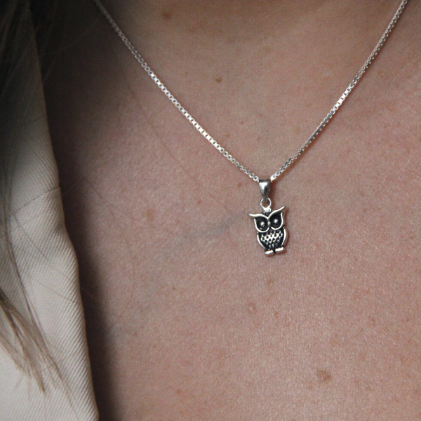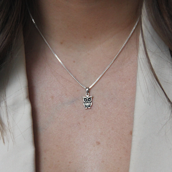 Ett halssmycke i form av en söt liten uggla med både bak och framsida. Ugglan mäter cirka 11x10mm. Finns även som matchande örhängen med artikelnummer OH0766.