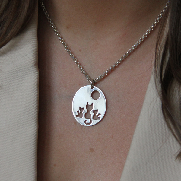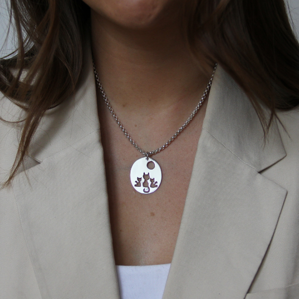 Har du sett något så gulligt förut? Ett halssmycke i silver föreställande tre stycken katter på en stor silverplatta. Silverplattan mäter 30x25mm.
