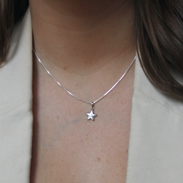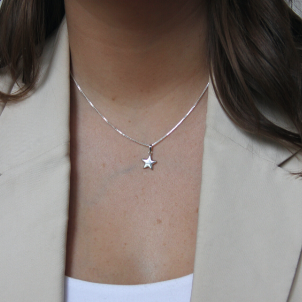 Gulligt liten stjärna ca 10mm mellan spetsarna. Kedja ingår ej i priset utan du väljer själv vilken silverkedja du vill ha i menyn för kedjor. Vi rekommenerar en klassisk ärtlänk, venezia eller kulkedja till denna lilla stjärna.