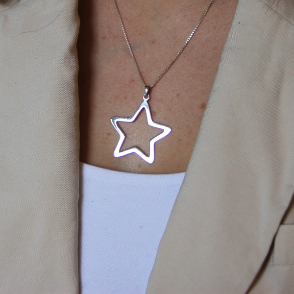 Ett silverhalssmycke i form av en gullig stjärna. Denna stjärna har en aning rundade "spetsar" och mäter ca 37mm i diameter. OBS! Kedja ingår inte utan det köper du från vår meny, "kedjor".