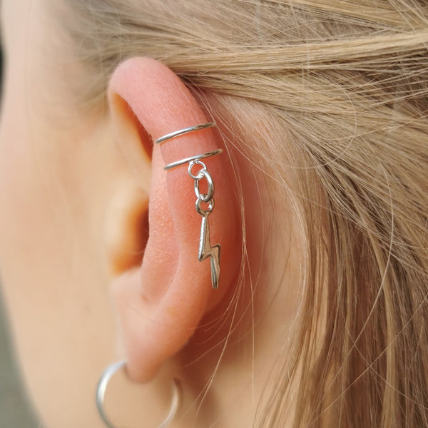 Denna söta lilla earcuff med en hängande blixt i äkta silver piffar till vilket öra som helst.