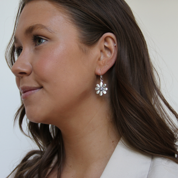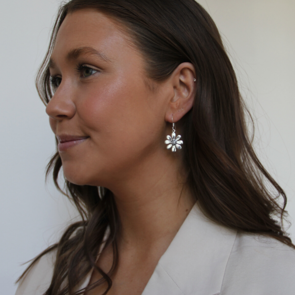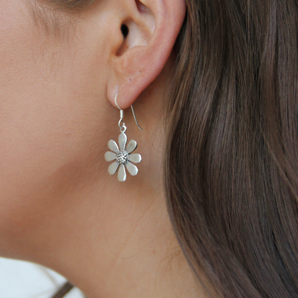 Våra fina örhänge Blossom, som också finns som halssmycke, är en fin blomma (prästkrage tror vi :-) som är ca 15mm i diameter. Hängs i örat med krok så att de dinglar vackert.