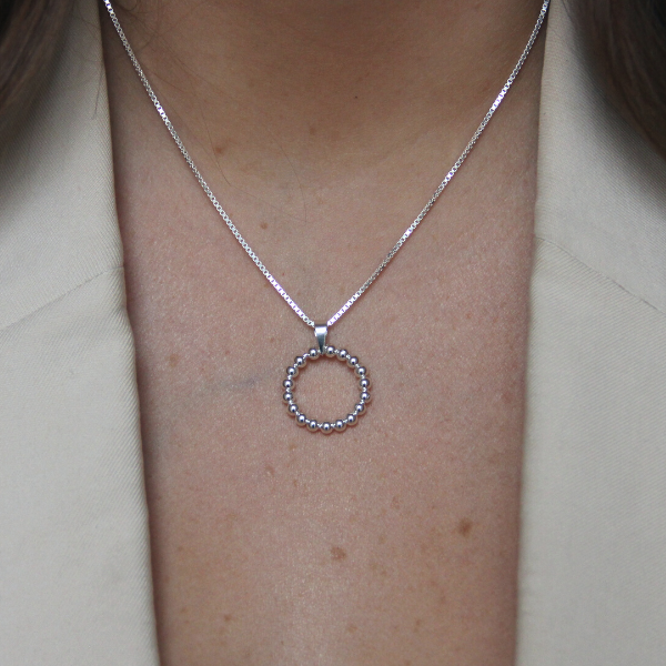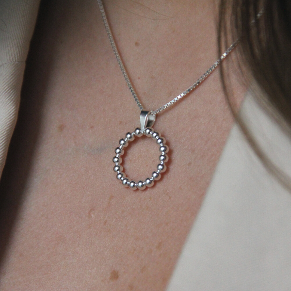 Ett halssmycke i silver, en rund cirkel med flera silverkulor. Halssmycket mäter 20mm i diamter och kulorna mäter 3mm i diameter.