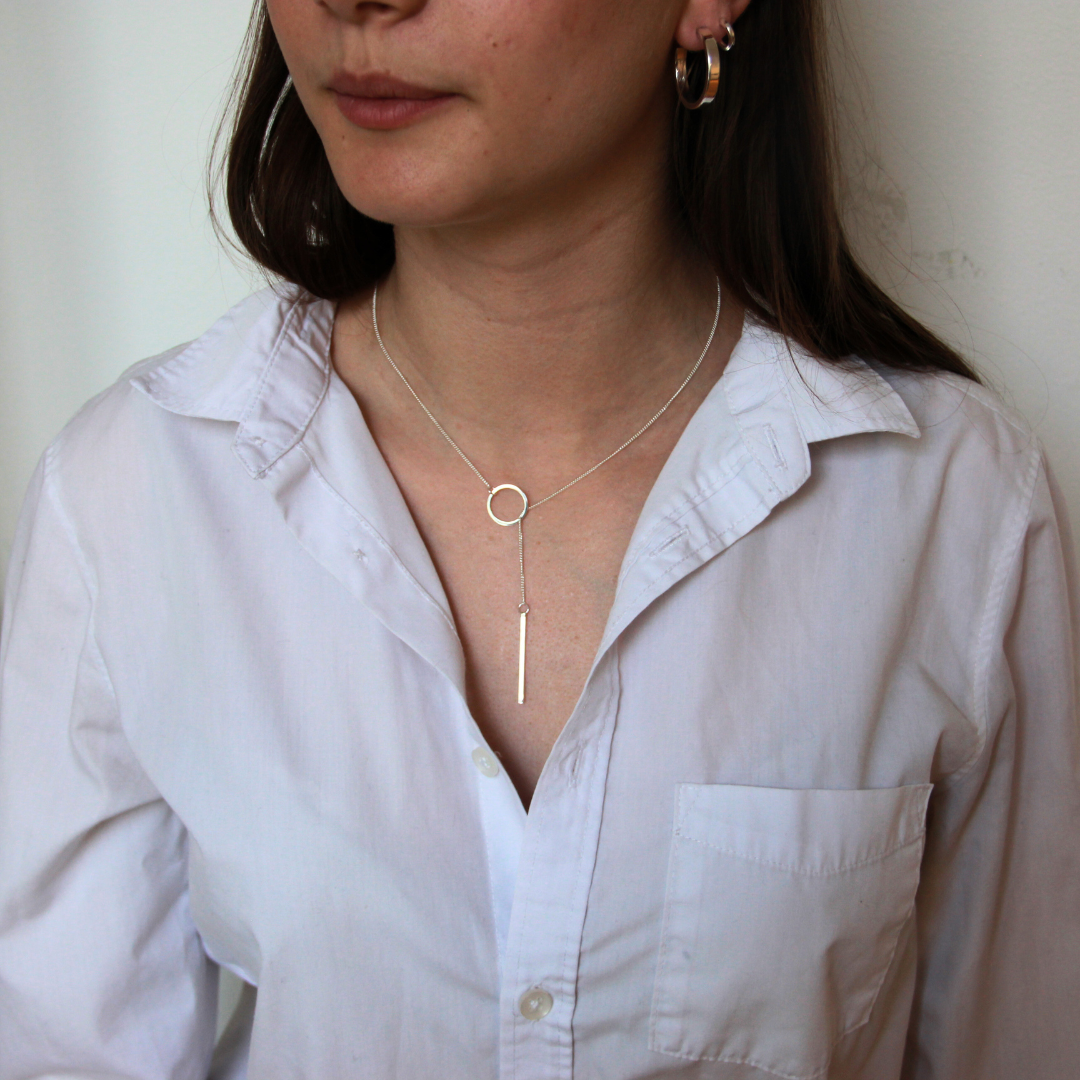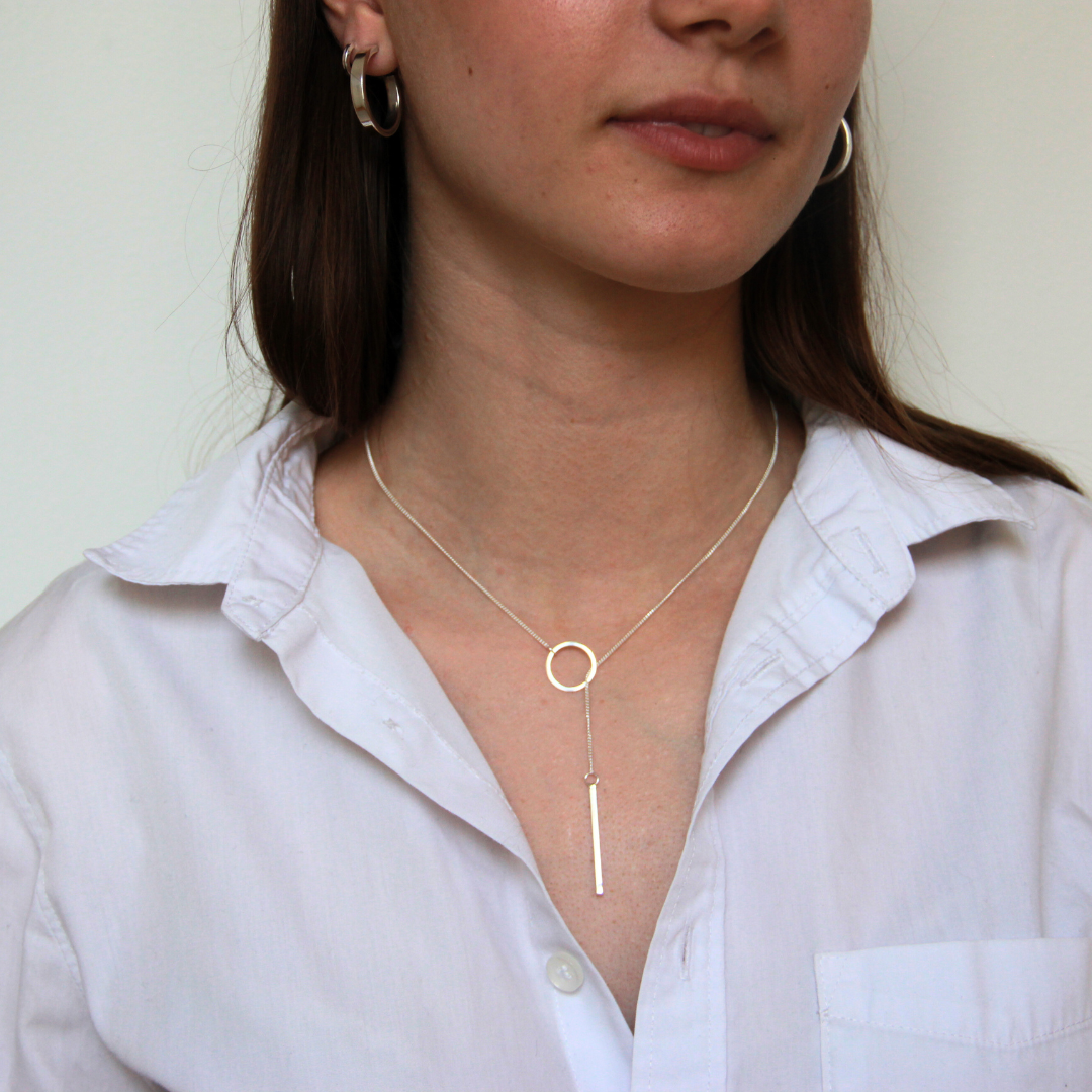 Ett halsband där den ena änden träs i cirkeln för en riktigt cool look. Förlängningskedja om 3 cm finns att reglera baktill.