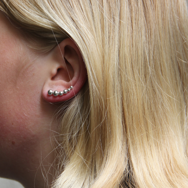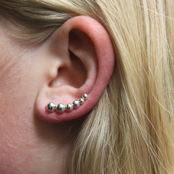 Snygga climbers med 6 stycken silverkulor i olika storlekar som klättrar uppför örat! Största kulan mäter ca 5 mm. Dessa sätts fast som ett vanligt örhänge i örat och klättrar uppför örat. Säljs styckvis, alltså kommer EN st i förpackningen.