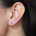 En earclimber som klättrar snyggt upp på örat med tre glittrande blommor. Färgen på färgkartan kallas "Rose" och har en snygg rosa färg. Earclimbern mäter cirka 21mm lång och 5mm bred.