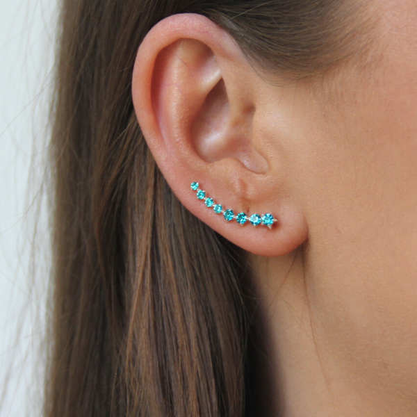 En earclimber som klättrar snyggt upp på örat med åtta stenar. Färgen på färgkartan kallas "Blue Zircon" och är en snygg mörk turkos färg.