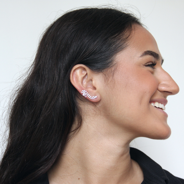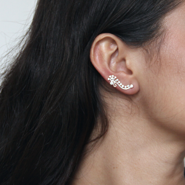 En otroligt vacker earclimber som slingrar sig fint upp på ditt öra, med massa små vita cubic zirkoner. 25x10mm stor. Denna produkt säljs EJ i par utan kommer EN styck i paketet. Modellen på bilden bär två styck bredvid varandra.