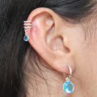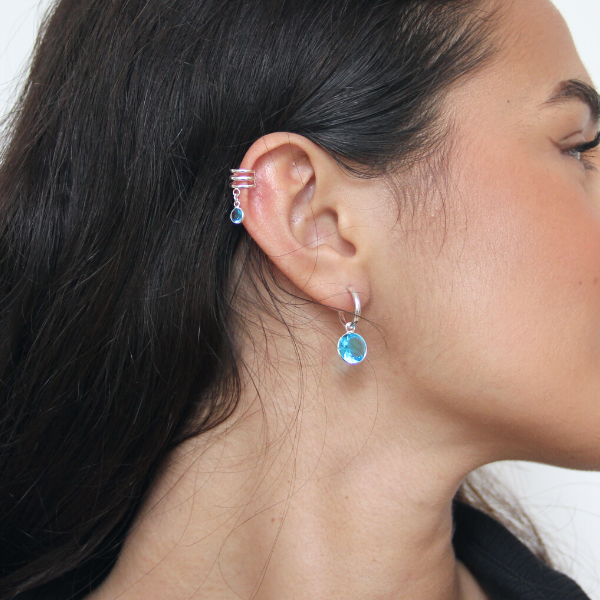 Vår populära earcuff "Three Strings" i ny tappning! Nu med en cubic zirkon sten i olika färger. Denna blåa färgen kallas "Indicolite". Stenen mäter 5mm i diameter. OBS! Denna produkt säljs EJ i par utan kommer EN styck i paketet.