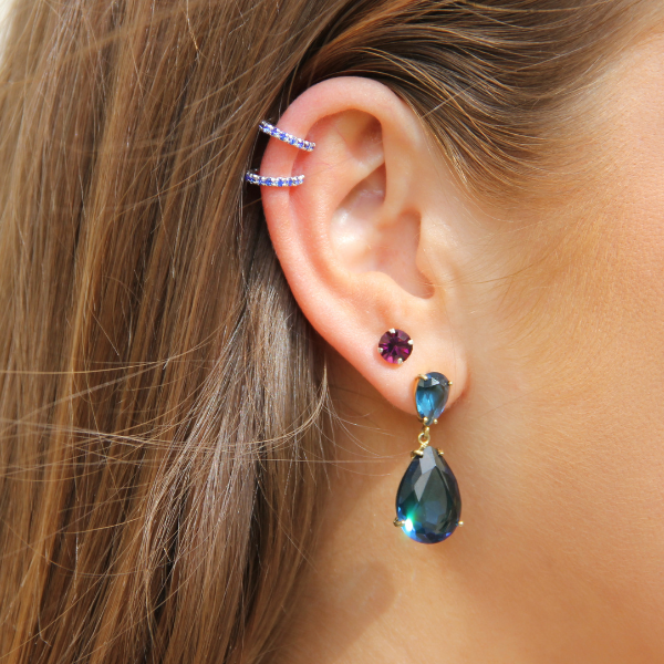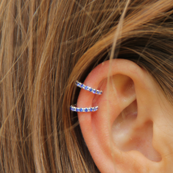 Liten earcuff med blingande zirkonior i blå färg. Kan även användas som nässmycke.