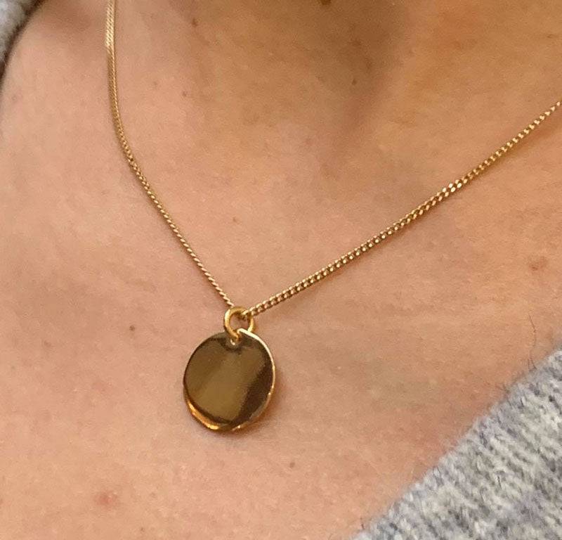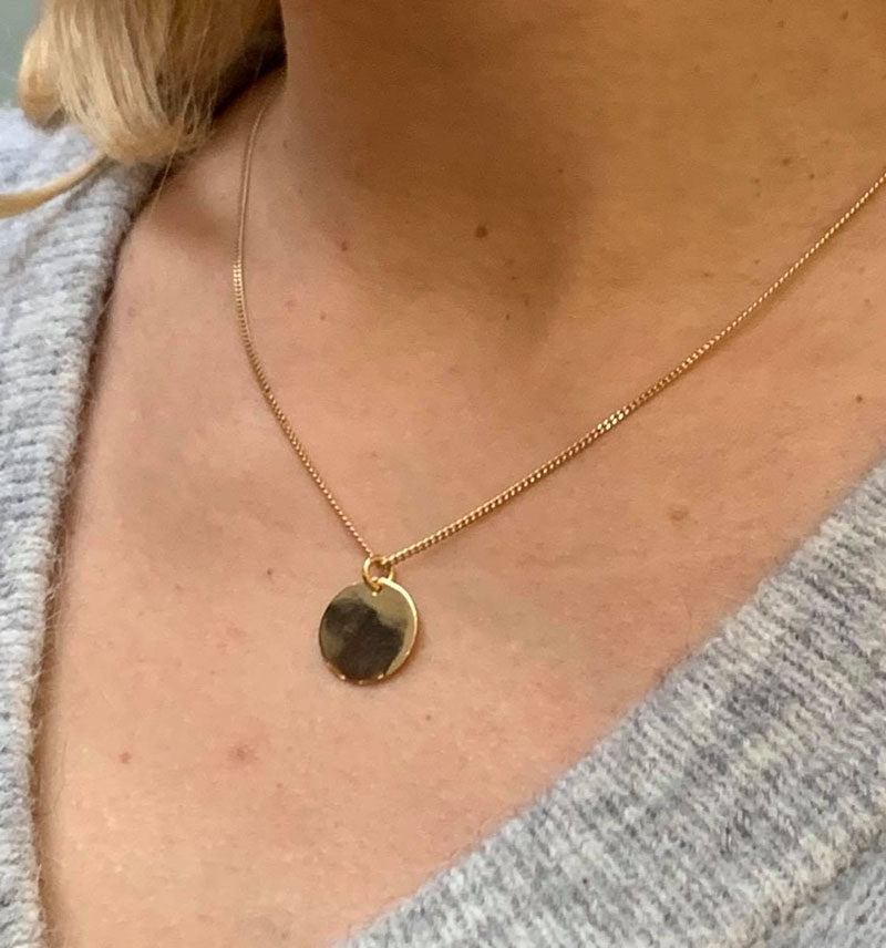 Vackert halssmycke med en platt bricka. Brickan är ca 15 mm i diameter och pläterad med 18 guld. Vi rekommenderar en pansarlänk i guld till denna.
