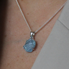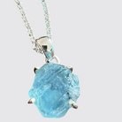 Denna akvamarin har brutits i Indien och den råa stenen bevarats och silverinfattningen har handgjorts för att anpassa stenens utforming.