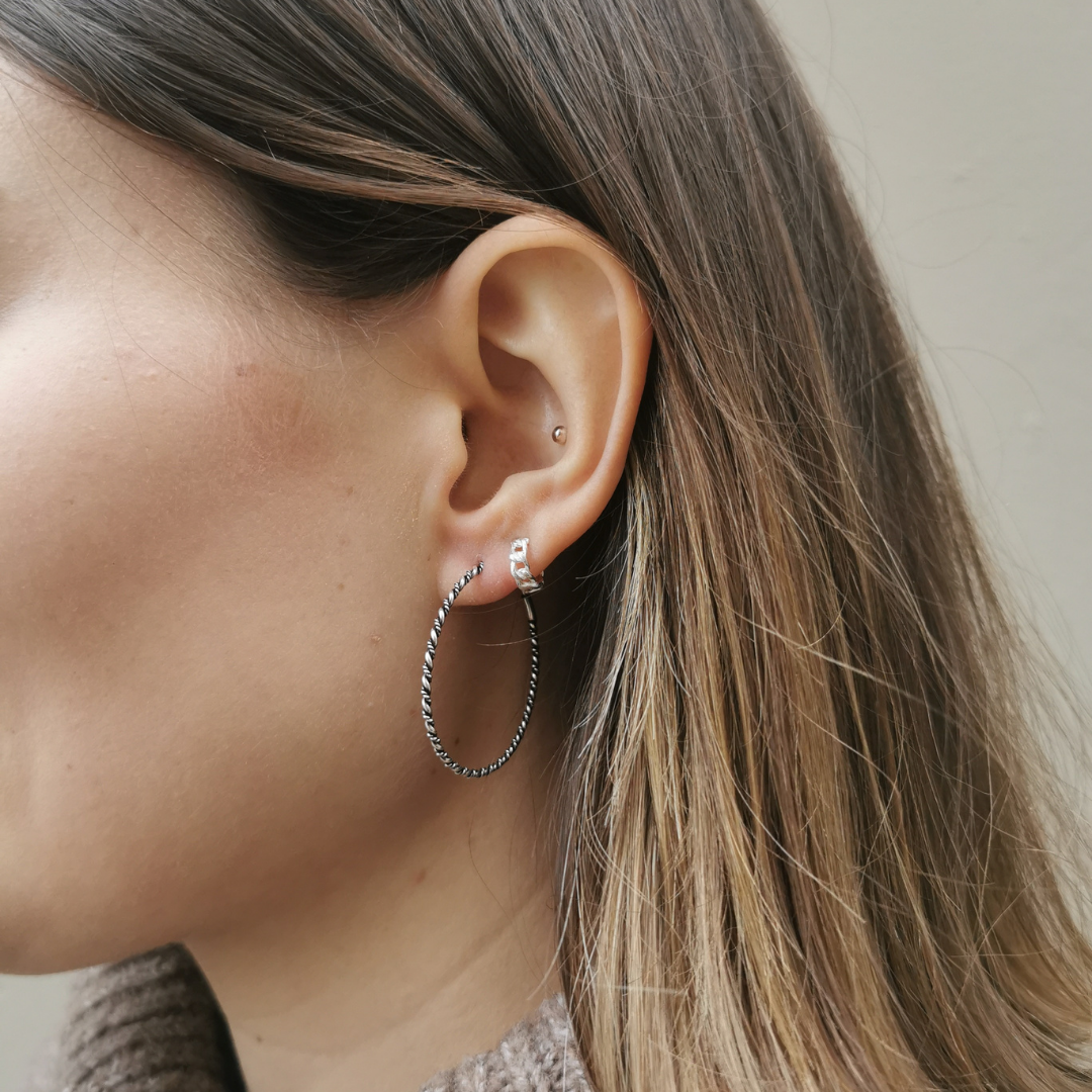 Creol i oval form med en twistad och oxiderad design. Ca 30x35mm. Tillverkade av äkta 925 sterling silver.