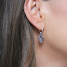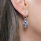 Ett par silverhoops med en hängande Fatimas hand. Själva Fatimas hand mäter 14x11mm och hoopsen mäter 12mm i diameter och är 1,2mm tjocka.