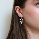 Ett par trendiga silverhoops med ett hängande Venustecken. Venustecknet kan du ta av och använda hoopsen som de är, eller byta ut den mot något annat. Denna kvinnosymbol som ibland också kallas för feministtecken har blivit ett populärt örhänge senaste tiden.