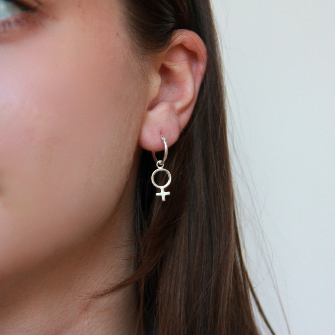 Ett par trendiga silverhoops med ett hängande Venustecken. Venustecknet kan du ta av och använda hoopsen som de är, eller byta ut den mot något annat. Denna kvinnosymbol som ibland också kallas för feministtecken har blivit ett populärt örhänge senaste tiden.
