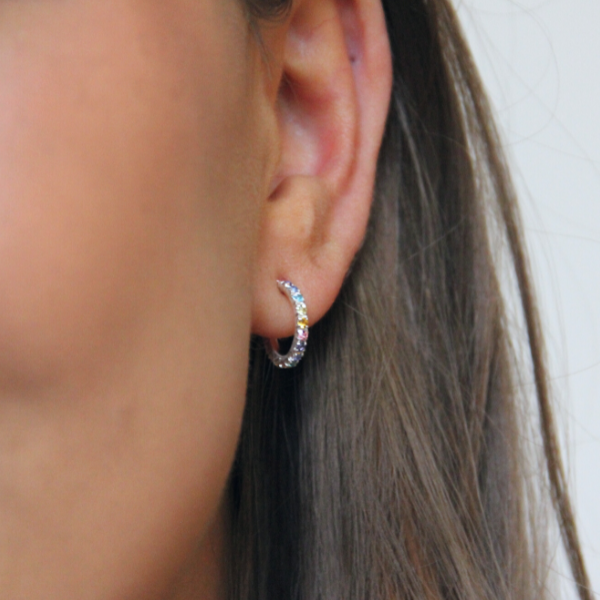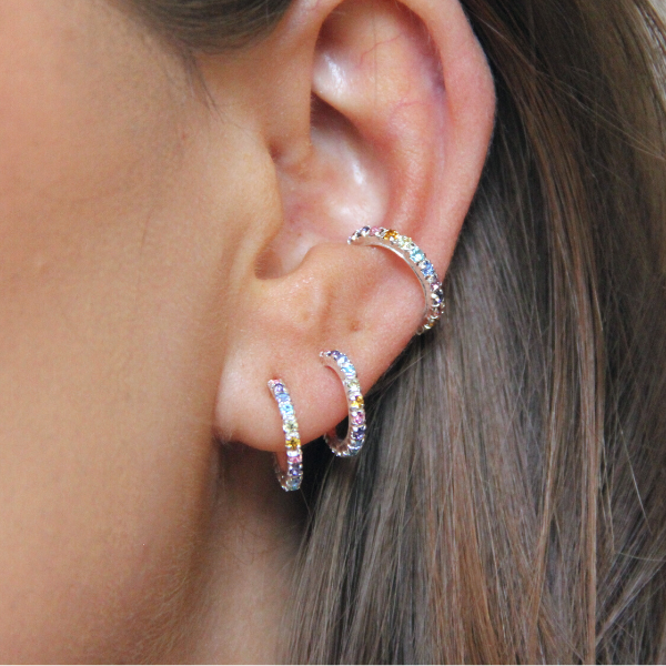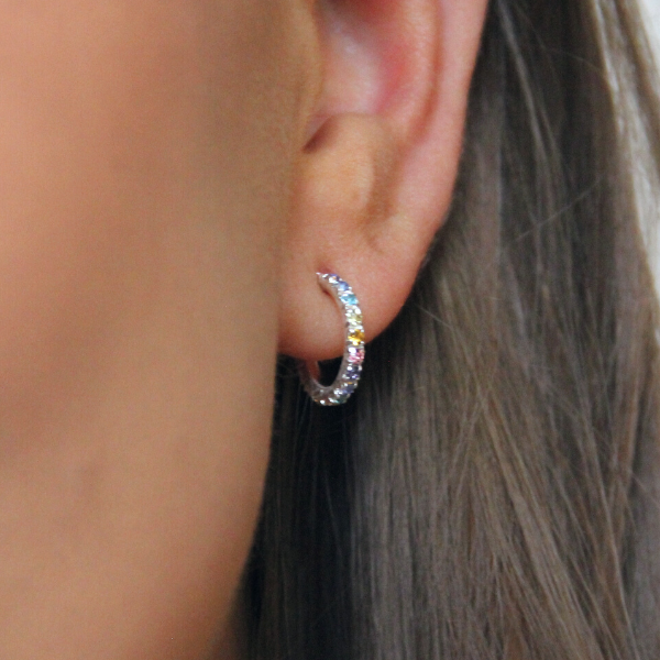 Trendiga creoler med multifärgade cubic zirkonia stenar. Örhänget har stift som knäpps med fjäril baktill. Mäter 2x12mm.