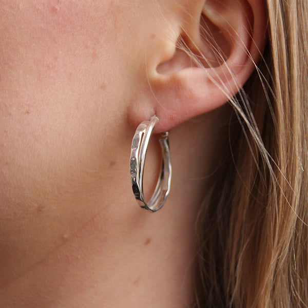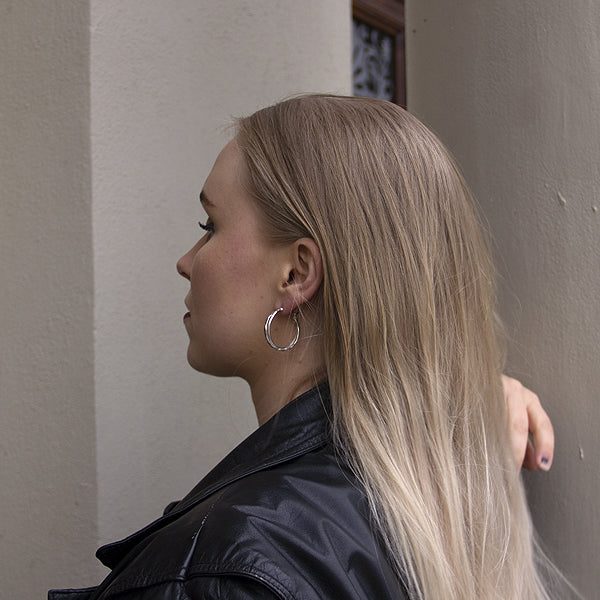 Dessa riktigt coola hoops är i äkta silver i storlek 3cm i diameter. Två creoler i en! Den ena ringen är hamrad för en riktigt snygg effekt och sätts enkelt i med en hasp som du klickar i.