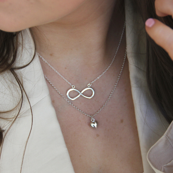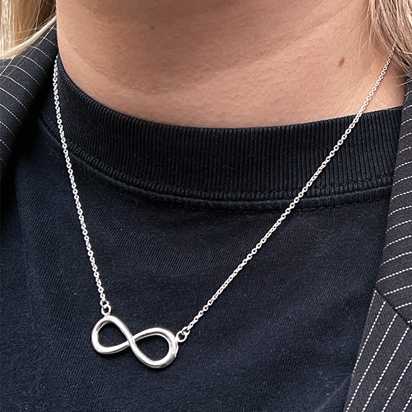 Ett klassiskt infinity halsband som mäter 40 cm och kan förlängas till 43 cm. Själva infinity tecknet är 3cm x 1cm.
