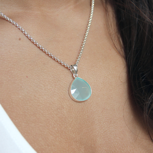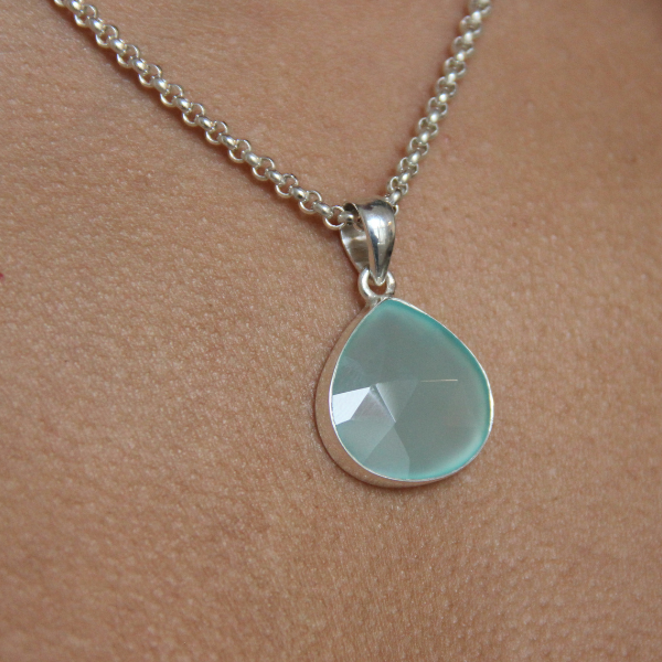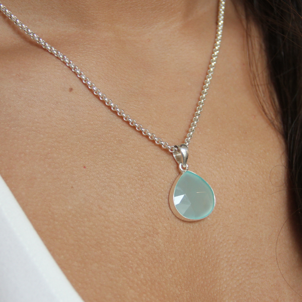 Ett vackert halssmycke med facetterad kalcedon. Halssmycket mäter cirka 34x21mm totalt. Kedja ingår ej, det väljer du själv till i menyn för kedjor om du önskar.