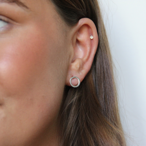 Ett par stilrena och klassiska örhängen i form av en ihålig cirkel. Cirkeln är ca 10 mm i diameter.