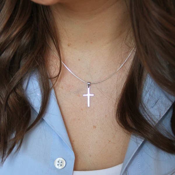 Ett klassiskt silverkors i mellanstorlek. Korset mäter ca 18x33mm. Kedja ingår ej utan du kan själv välja vilken längd och typ av kedja du vill ha i menyn under "kedjor".