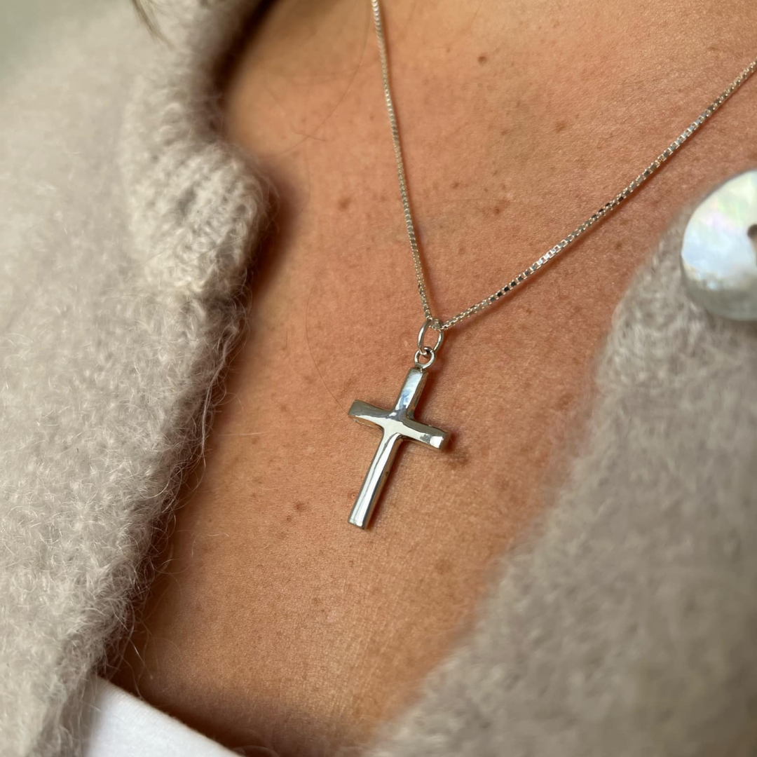 Ett klassiskt kors som är lite tjockare för att vara ett mindre kors. Detta kors mäter 27 på höjden och 18 på bredden. Silvret i korsets bredd är 3mm och tjockleken är 2 mm vilket gör att det blir ett ganska rejäl kors, trots sin storlek. Superfint!