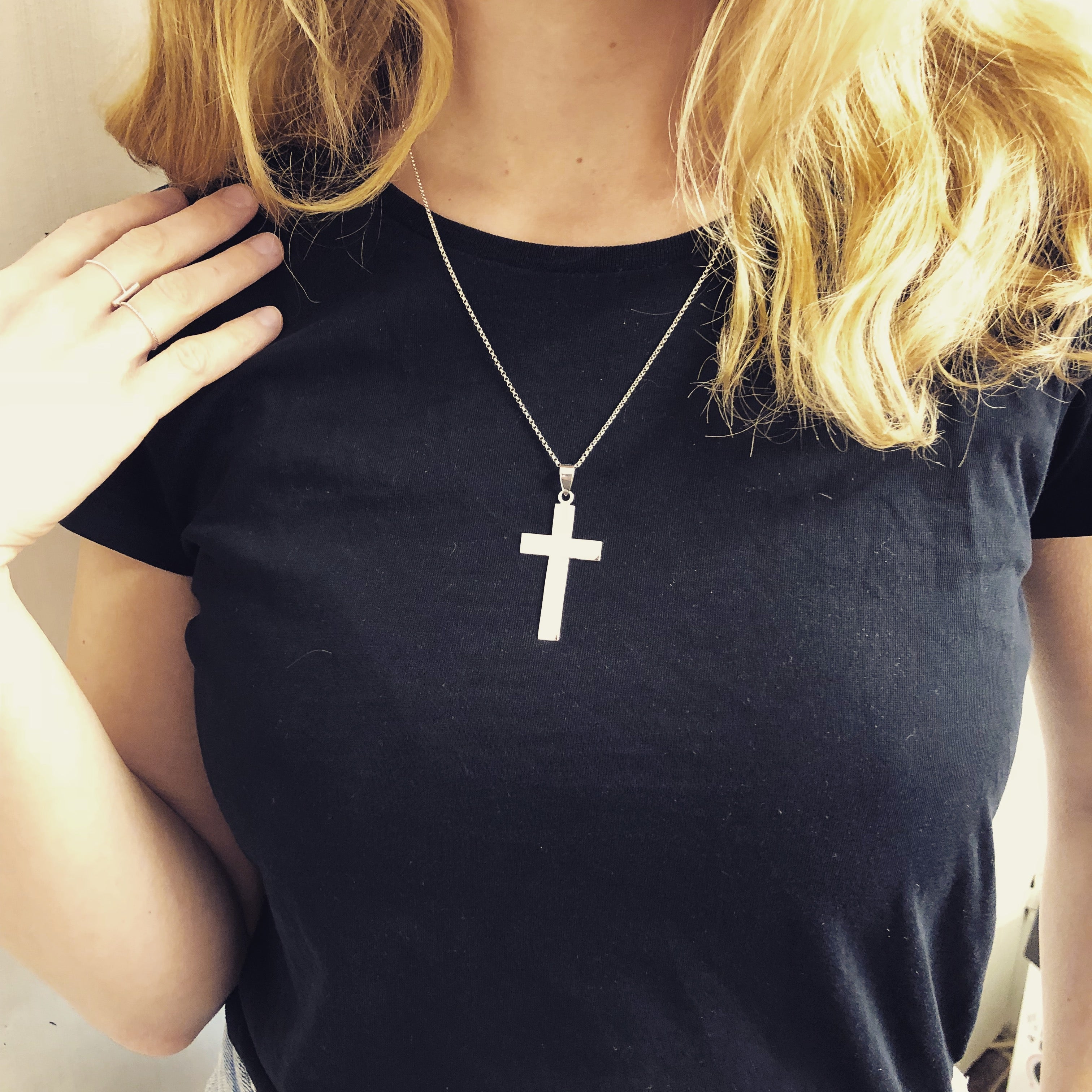 Halssmycke i form av ett stort kors. Vi rekommenderar en klassisk 3 mm tjock ärtlänk till. Alla kedjor hittar du under rubriken Kedjor!