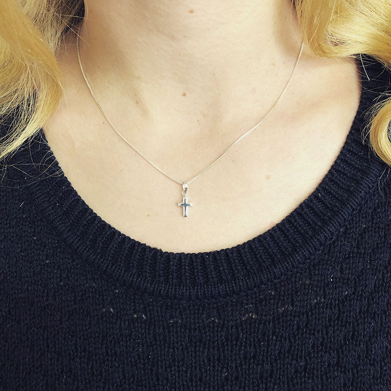 Litet fint halssmycke i form av ett kors. 10 mm högt och 6 mm brett. Du kan köpa till kedja under menyn Kedjor! Ett vackert halsband med litet kors.