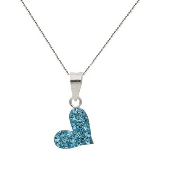Sött strasshjärta med massa små kristaller i färgen aqua bohemica som är en ljusblå/turkos variant. Till detta smycke rekommenderar vi en kulkedja som glittrar vackert till smycket. Du kan själv välja längd på kedjan i menyn. Smycket är 11x10 mm.