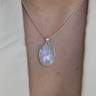 Ett otroligt vackert halssmycke med äkta månsten. Skimrar i blått och regnbågens alla färger. Varje sten är unik.