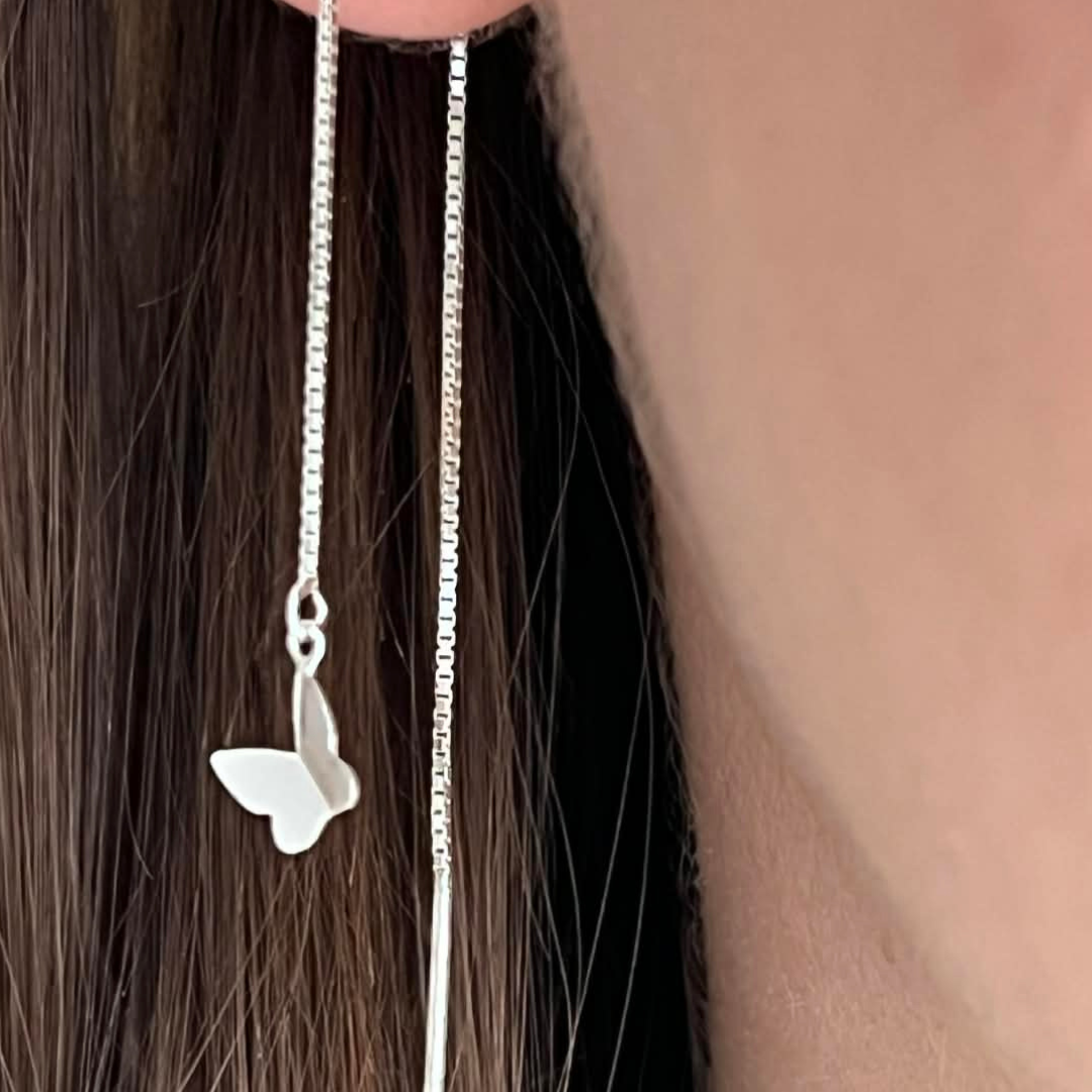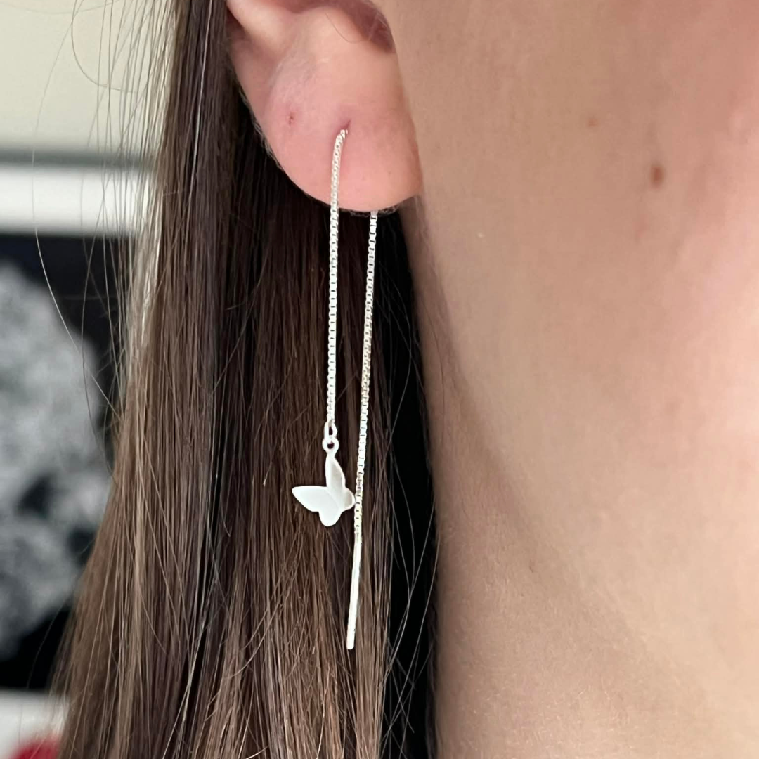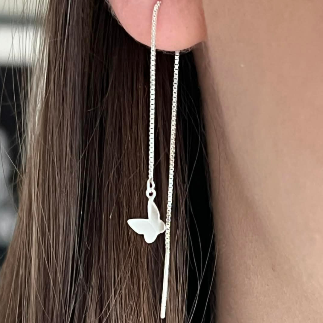 En söt fjäril som dinglar på en silverkedja. Hur somrigt kan det bli? Kedjan drar man genom örat så att det även hänger på baksidan av örat, superfint!