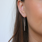 Ett par snygga silverörhängen som dras igenom örat som på bilden. En lång silverpinne hänger och dinglar snyggt i örat. Silverpinnen är 28mm lång och själva örhänget, från piggen till slutet av silverpinnen, mäter 88mm.