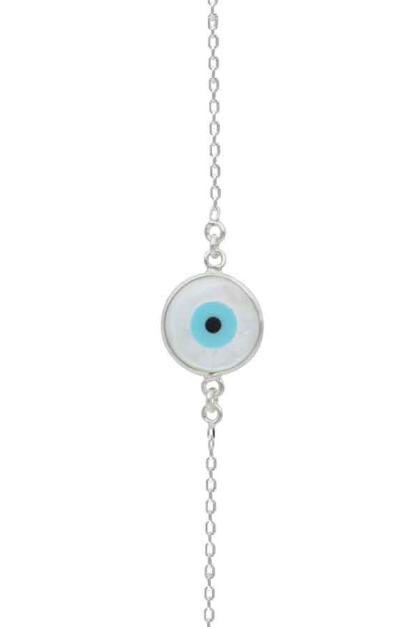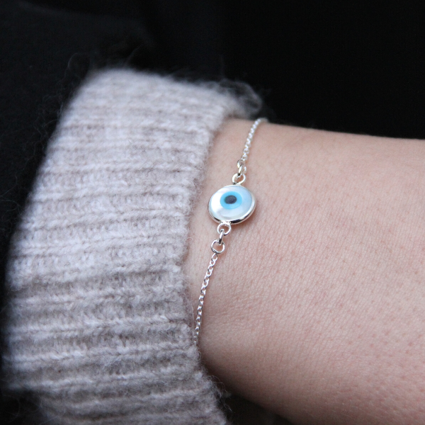 Detta är en variant av "Nazars öga" som är en amulett skapad att skydda mot "det onda ögat". Så känner du att du ofta har onda ögon på dig, kan alltså detta smycke vara något för dig. Eller har du det på dig helt enkelt för att det är fint... Armbandet har en tunn och elegant kedja som är 15,5 cm lång med en förlängningskedja på 3 cm och kan alltså bli 19 cm lång. Nazars öga är 10 mm i diameter.