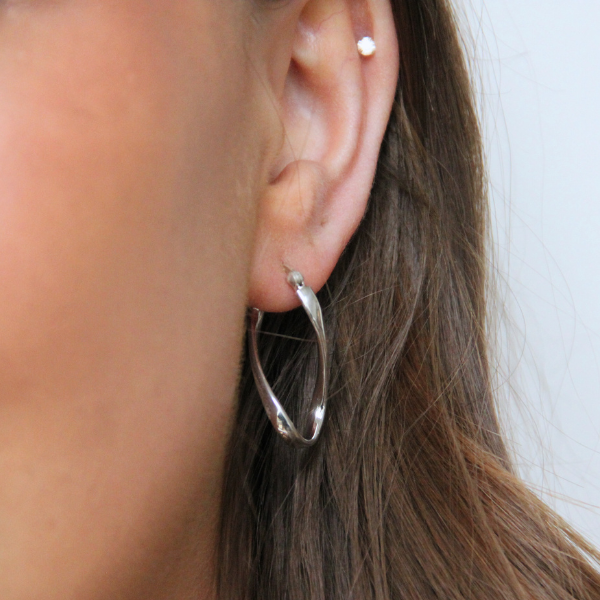 Ett par snygga silverhoops i form av en swirl, som i vissa vinklar ser ut som ett infinitytecken. Dessa snygga silverhoops mäter ca 30x15 på de bredaste ställena.