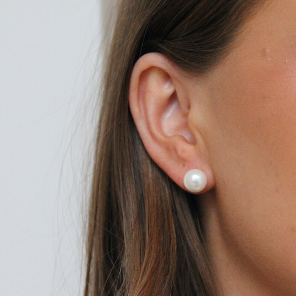 Ett par stora pärlörhängen som mäter 10mm i diameter. Dessa kallar vi för "perfect pearl" då de är gjorda för att vara perfekt runda, eftersom vi märkt att efterfrågan varit stor på just perfekta pärlor. Dessa pärlor kallas skalpärlor. Själva stiftet och "pluppen" är 925 Sterling Silver.