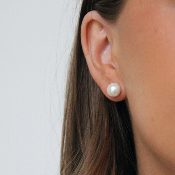 Ett par stora pärlörhängen som mäter 9mm i diameter. Dessa kallar vi för "perfect pearl" då de är gjorda för att vara perfekt runda, eftersom vi märkt att efterfrågan varit stor på just perfekta pärlor. Dessa pärlor kallas skalpärlor. Själva stiftet och "pluppen" är 925 Sterling Silver.