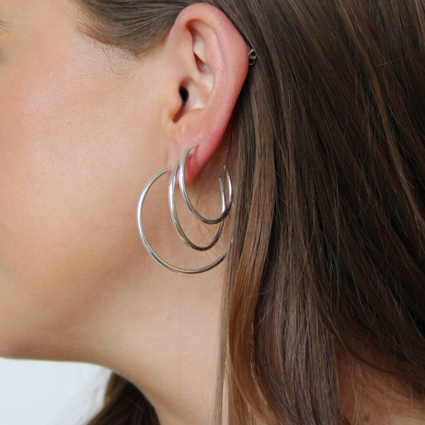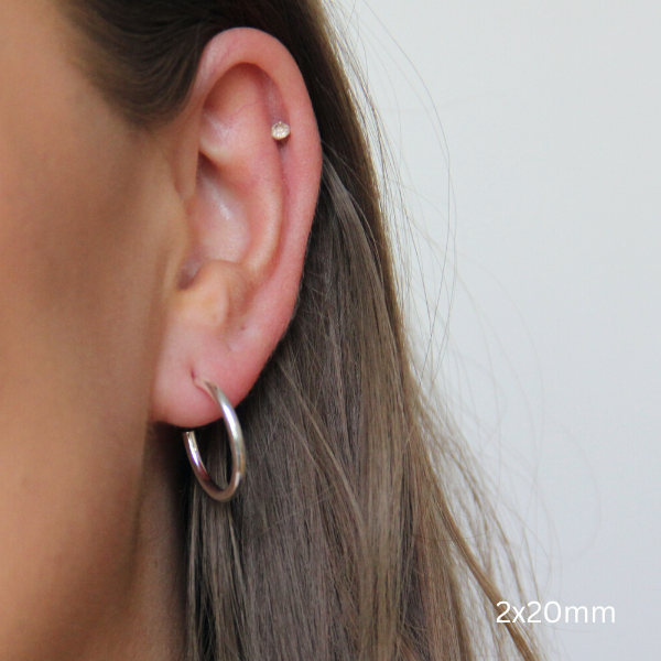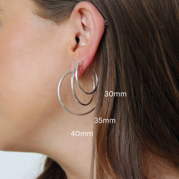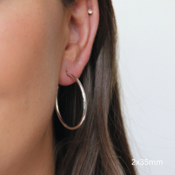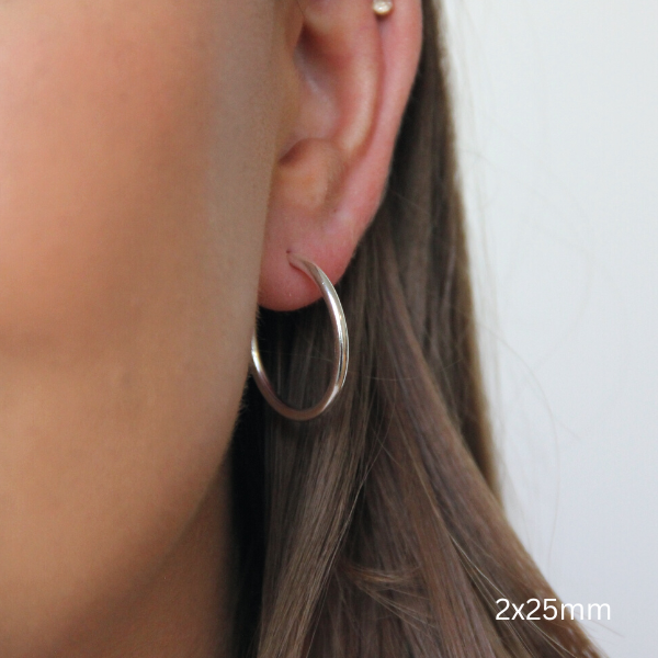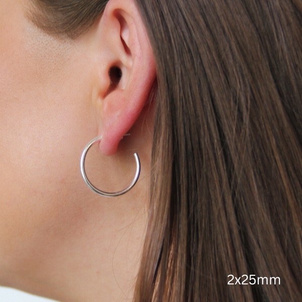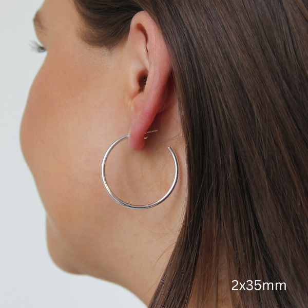 Klassiska silverhoops/creoler i tjockleken 1,5mm. Dessa hoops knäpps med stift och fluga baktill. Om man tycker att instickshoops är lite pilliga är detta en variant att föredra. Stora storlekar, dvs diameter från 20mm och uppåt.