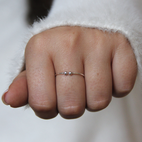 Ring med två små kulor. Jättefin att ha för sig själv eller tillsammans med flera andra ringar. Silver är ett mjukt material och tunt silver kan komma att forma sig efter ditt finger när du använt det ett tag.