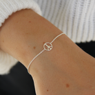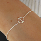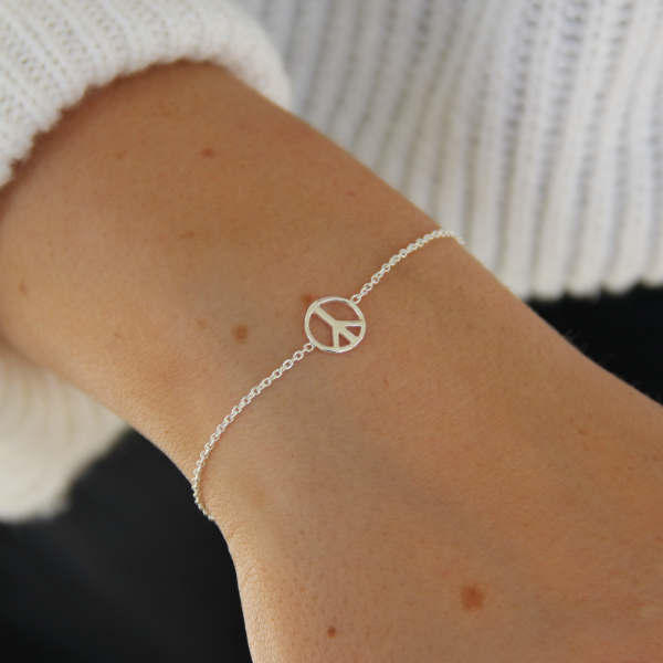 Ett snyggt armband med peacetecken på en tunn silverkedja. Armbandet finns i två längder med en förlängningskedja på 3cm. Peacetecknet mäter 9mm i diameter.